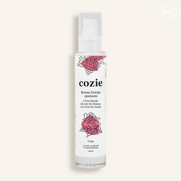 rosa damascena flower water* (eau florale de rose de Damas), aqua (eau), vitis vinifera fruit water*(eau de raisin), vaccinium macrocarpon fruit water* (eau de canneberge), glycerin, lactobacillus ferment (bactéries végétales fermentées), betaine (issue de la betterave sucrière), sodium levulinate (entretien la peau), parfum, sodium anisate (antimicrobien), citric acid (acide citrique), citronellol (parfumant), eugenol (parfumant). *Issus de l'agriculture biologique